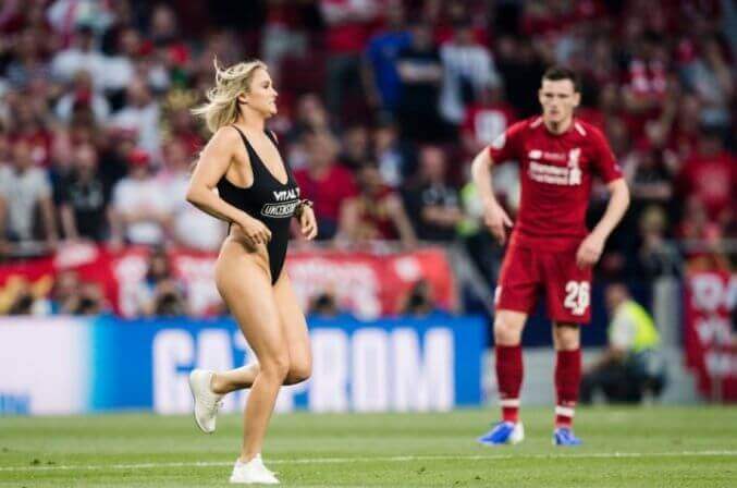 Bạn còn nhớ Kinsay Volanski, cô gái chạy trần trong trận chung kết Champions League năm 2019 với bộ đồ tắm cực kỳ phản cảm? Hành động táo bạo này đã khiến cô trở thành hiện tượng mạng ngay lập tức. Khi đó, cô chạy trên sân bóng trước hơn 63.000 khán giả và hàng triệu người xem trên truyền hình, với mục đích quảng bá trang web khiêu dâm của bạn trai cô lúc bấy giờ, Vitaly Zdorovetskiy.